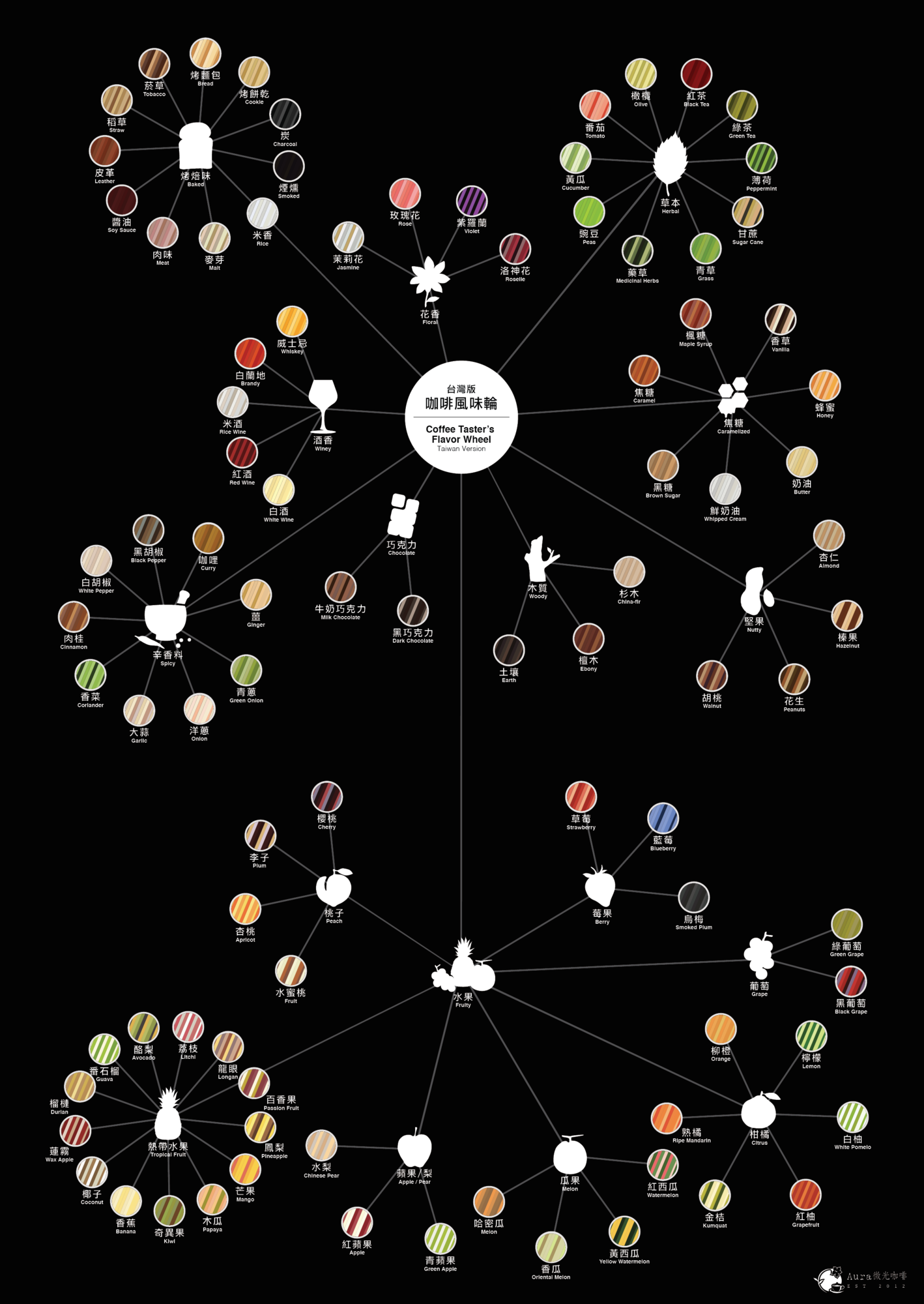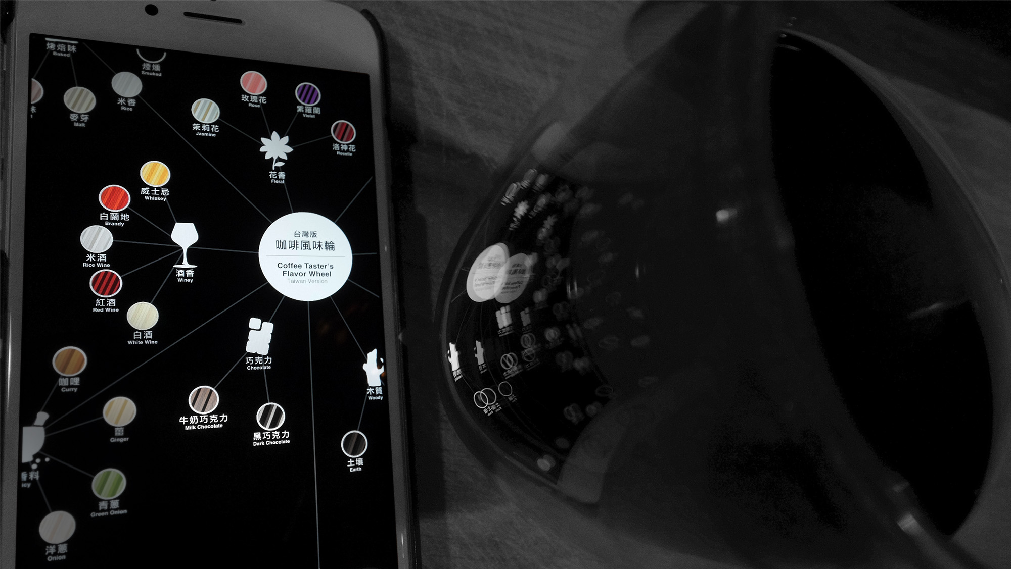 以美國精品咖啡協會的風味輪出發,篩選掉部分我們陌生的風味、加入更多台灣在地所熟悉的食物、素材。針對在地族群打造屬於台灣人的咖啡風味輪。採用實物取色的方式定義色彩,並將16個基調風味圖像化,讓人更迅速地掌握每支咖啡的風貌。